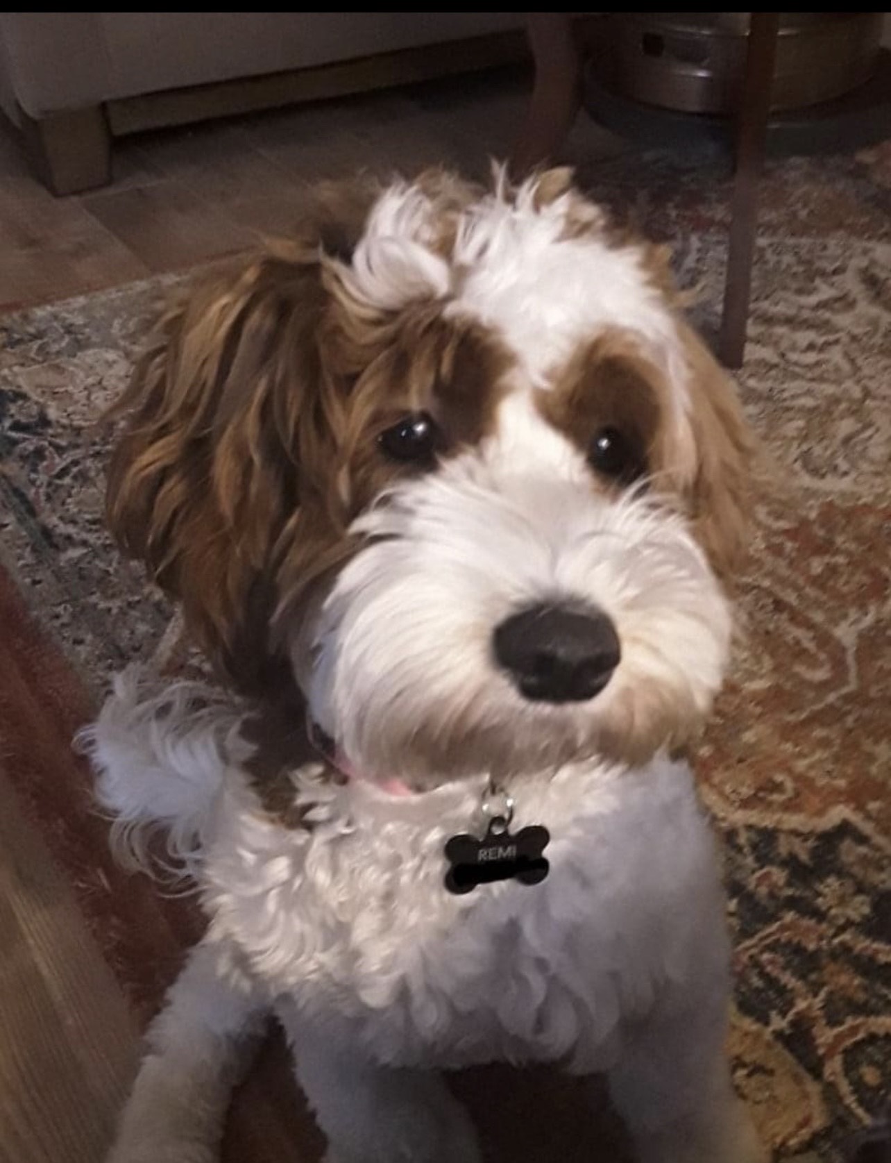 Remi is a 35 pound Parti-colored cinnamon multigenerational goldendoodle. She loves to play with her toys and go for walks with her guardians and her best friend and roommate, another miniature goldendoodle. She is full of love and fun!